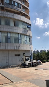 24米高空车载人清洗外墙施工现场